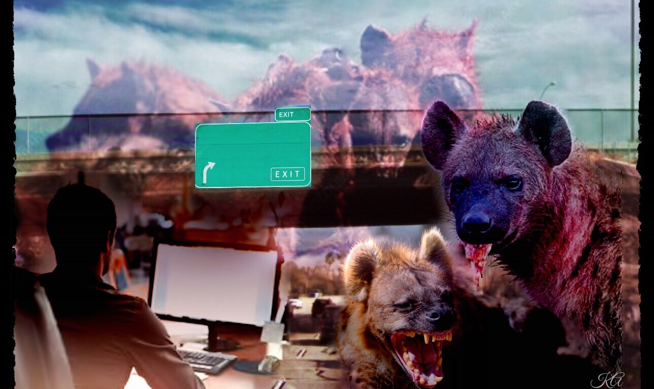 Then it came again from the top of the hill overlooking his wing. They were readying themselves for him, he knew without knowing. Hyenas ate everything from their kill, even the bones. He envisioned their muzzles, engorged in his blood. “Hee hee hee,” rang out like a reply. There was a group of them stirring each other up like his clients and his coworkers would. Maybe they had transformed into these powerful and ruthless animals. Again, he thought, “Here it is.” The portal was widening, fueled by his negativity and loneliness in a darkening world.